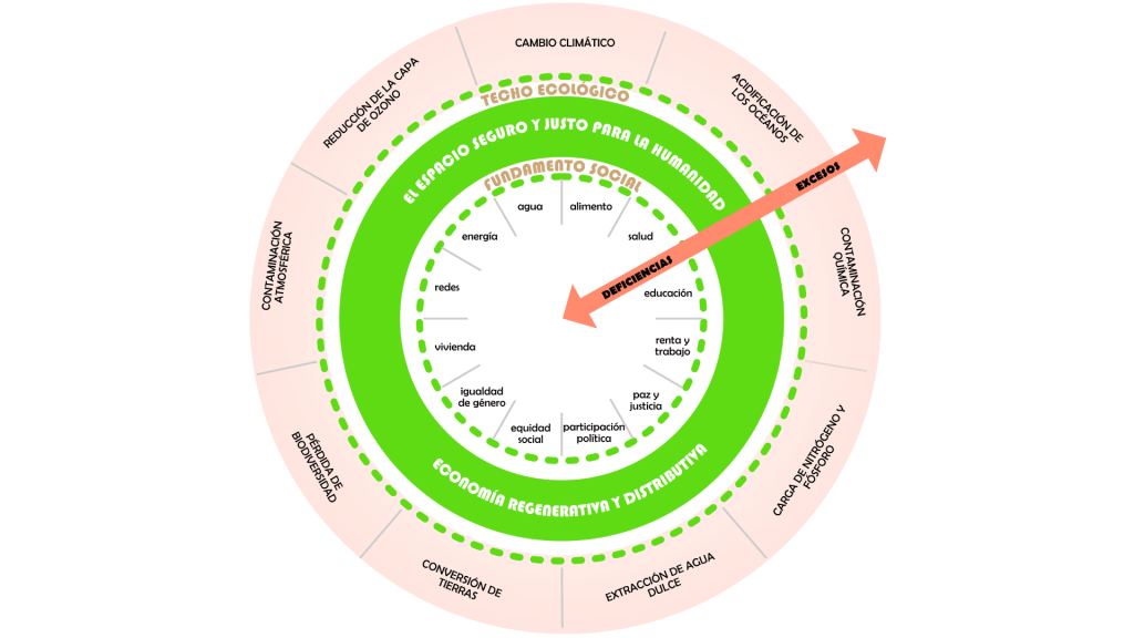 El marco del donut se estructura en dos anillos concéntricos: el anillo interior define el “suelo social” mínimo necesario para garantizar el bienestar humano —acceso a agua potable, alimentación, salud, educación, vivienda, trabajo, equidad, paz, energía, conectividad, entre otros—, mientras que el anillo exterior marca el “techo ecológico”, compuesto por límites planetarios como el cambio climático, la pérdida de biodiversidad, la acidificación de los océanos o la contaminación química. El espacio entre ambos anillos, la masa del donut, representa la zona segura y justa donde la humanidad puede prosperar de forma sostenible.